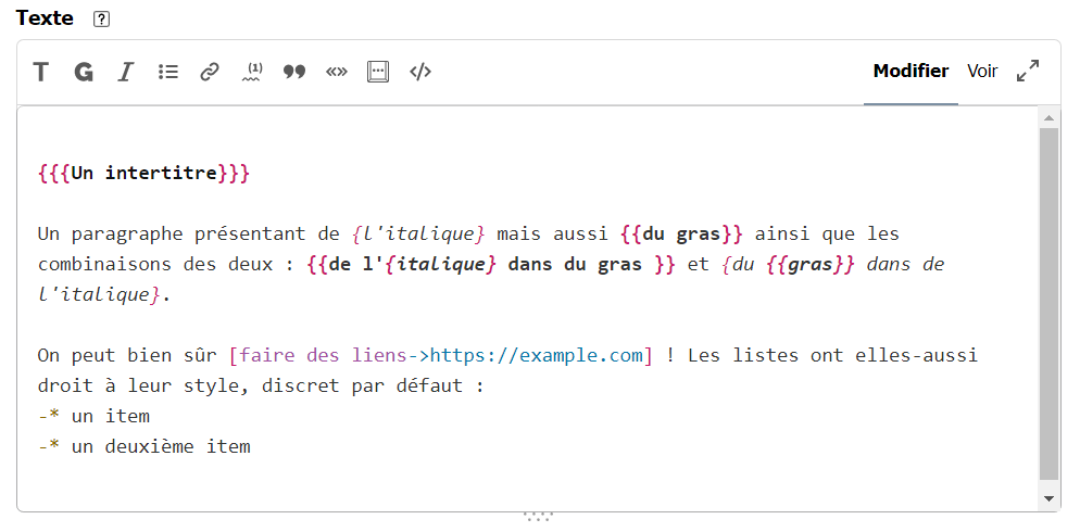 Il convient de noter que Prism propose la coloration syntaxique et des raccourcis typographiques propres à SPIP et la syntaxe Markdown, lorsque le plugin Markdown est actif et configuré pour appliquer la syntaxe Markdown par défaut.
