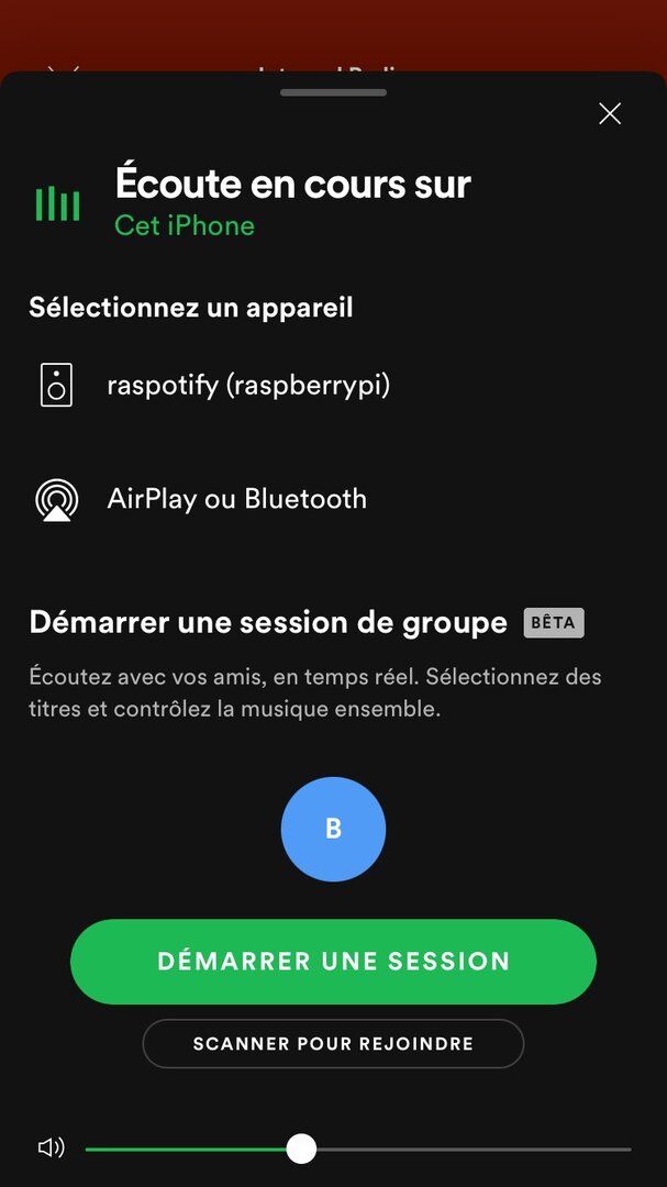 Ensuite, depuis votre application Spotify, il suffit de sélectionner la sortie « Raspotify » dans les options proposées dans le menu accessible depuis l’icone dans le bas inférieur gauche de l’écran de lecture :