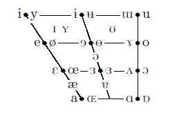 L’environnement vowel est fourni par le package vowel proposé avec tipa. Il permet de créer des triangles et trapèzes vocaliques hautement « configurables ». Voici un exemple tiré de la documentation du package :